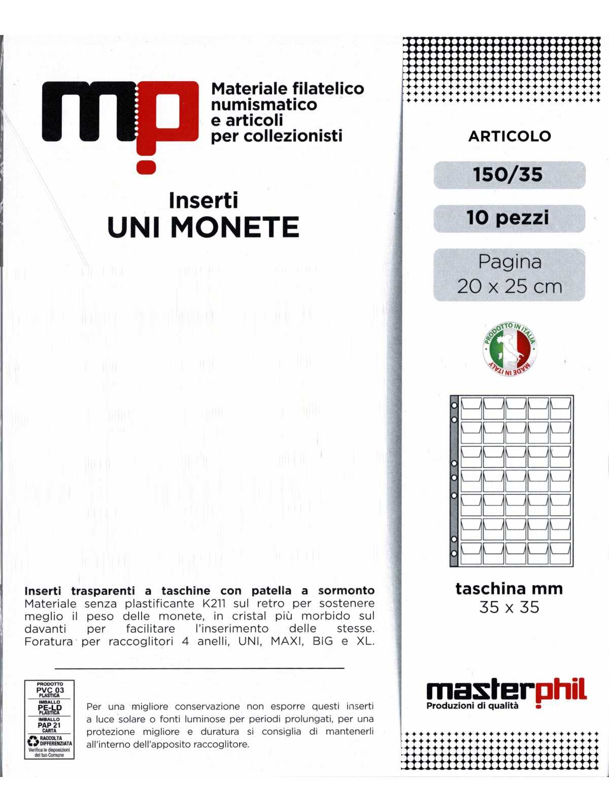 MASTERPHIL 10 INSERTI PER MONETE A 35 CASELLE CON FOGLI DI SUPPORTO Art. 150/35