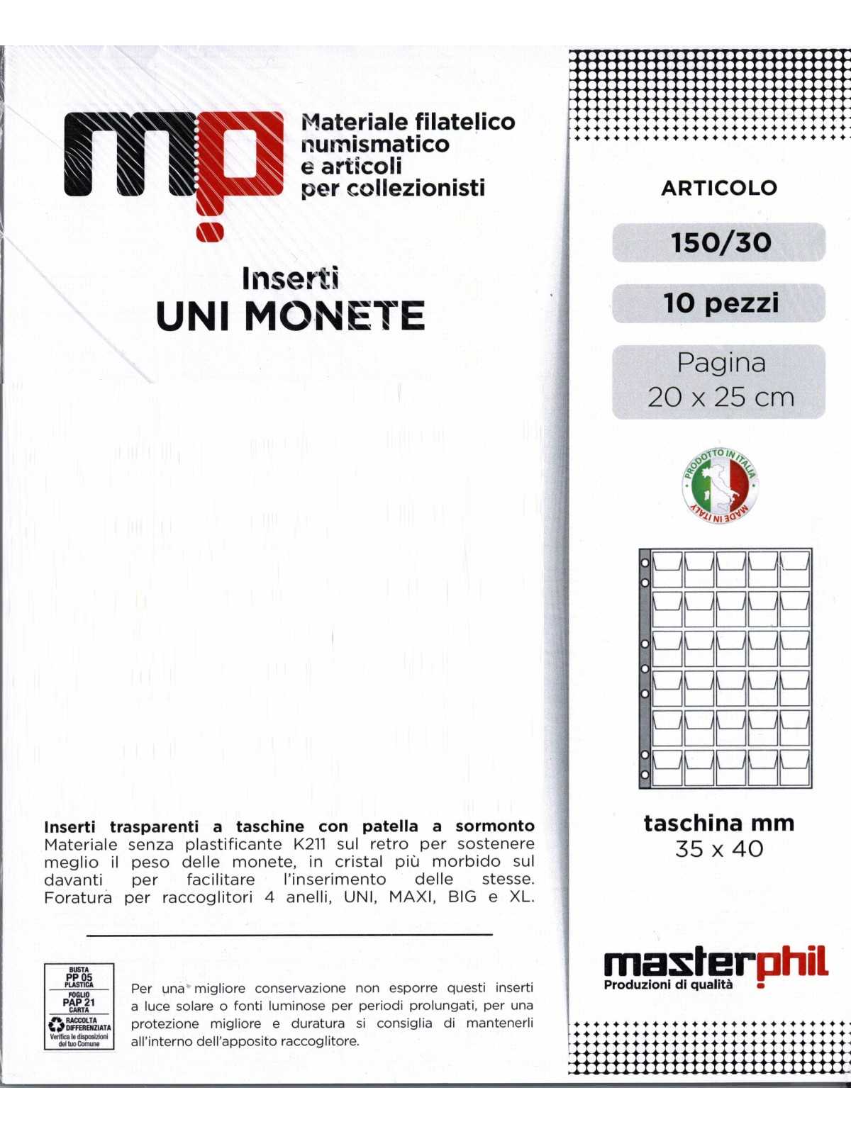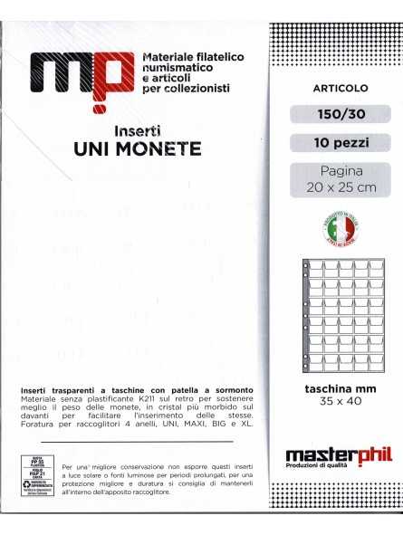 MASTERPHIL 10 INSERTI PER MONETE A 30 CASELLE CON FOGLI DI SUPPORTO Art. 150/30