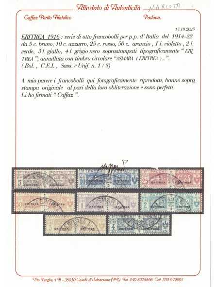 1916 ERITREA PACCHI POSTALI 8 V USATI SASSONE N. 1/8 CERT. CAFFAZ MF133364