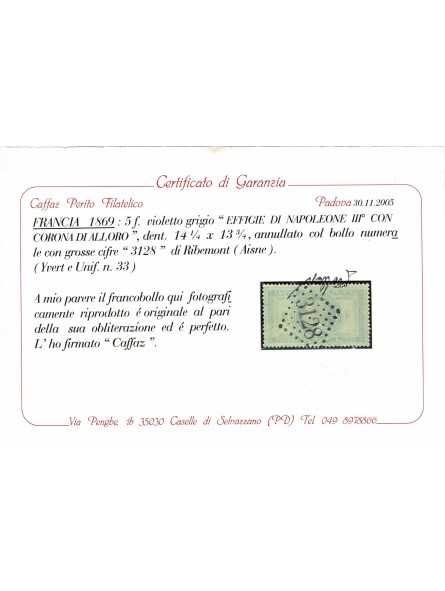1862-70 FRANCIA IMPERO EMPIRE FRANCAIS NAPOLEONE III° 5 F USATO CAFFAZ MF133924