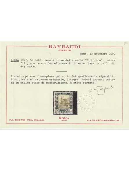 1927 LIBIA PITTORICA 50c. NERO E OLIVA N° 64 SENZA FILIGRANA MNH RAYBAUDI MF126527