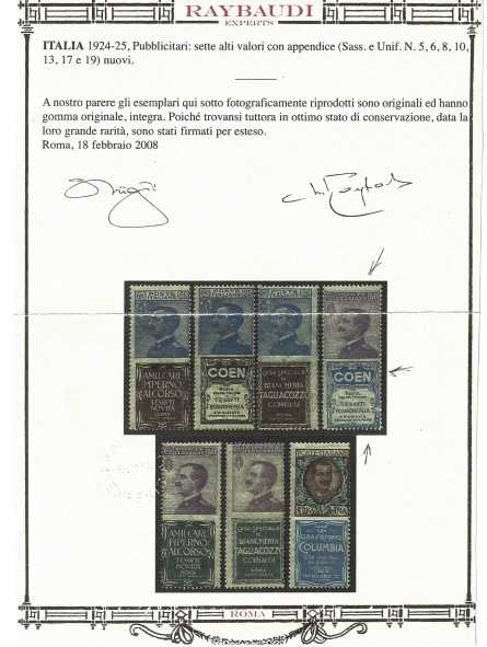 UNITAMENTE AL FRANCOBOLLO FORNIREMO CERTIFICATO DI GARANZIA FERRARIO E FOTOCOPIA DEL CERTIFICATO RAYBAUDI DELLA SERIE DI PROVENIENZA
