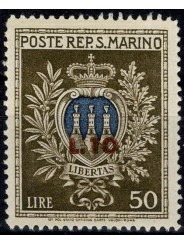 FRANCOBOLLO DA LIRE 50 DELLA SERIE STEMMI SOPRASTAMPATO IN ROSSO LIRE 10