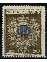 FRANCOBOLLO DA LIRE 50 DELLA SERIE STEMMI SOPRASTAMPATO IN ROSSO LIRE 10