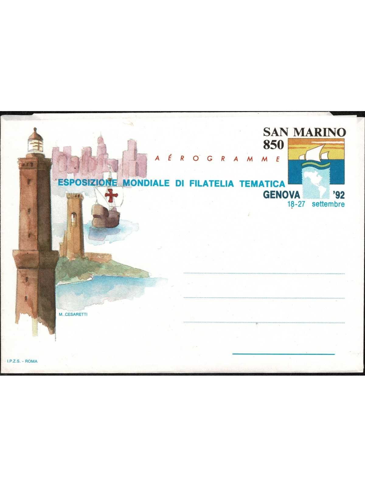 1992 SAN MARINO AEROGRAMMA EXPO GENOVA '92 NUOVO MF135160