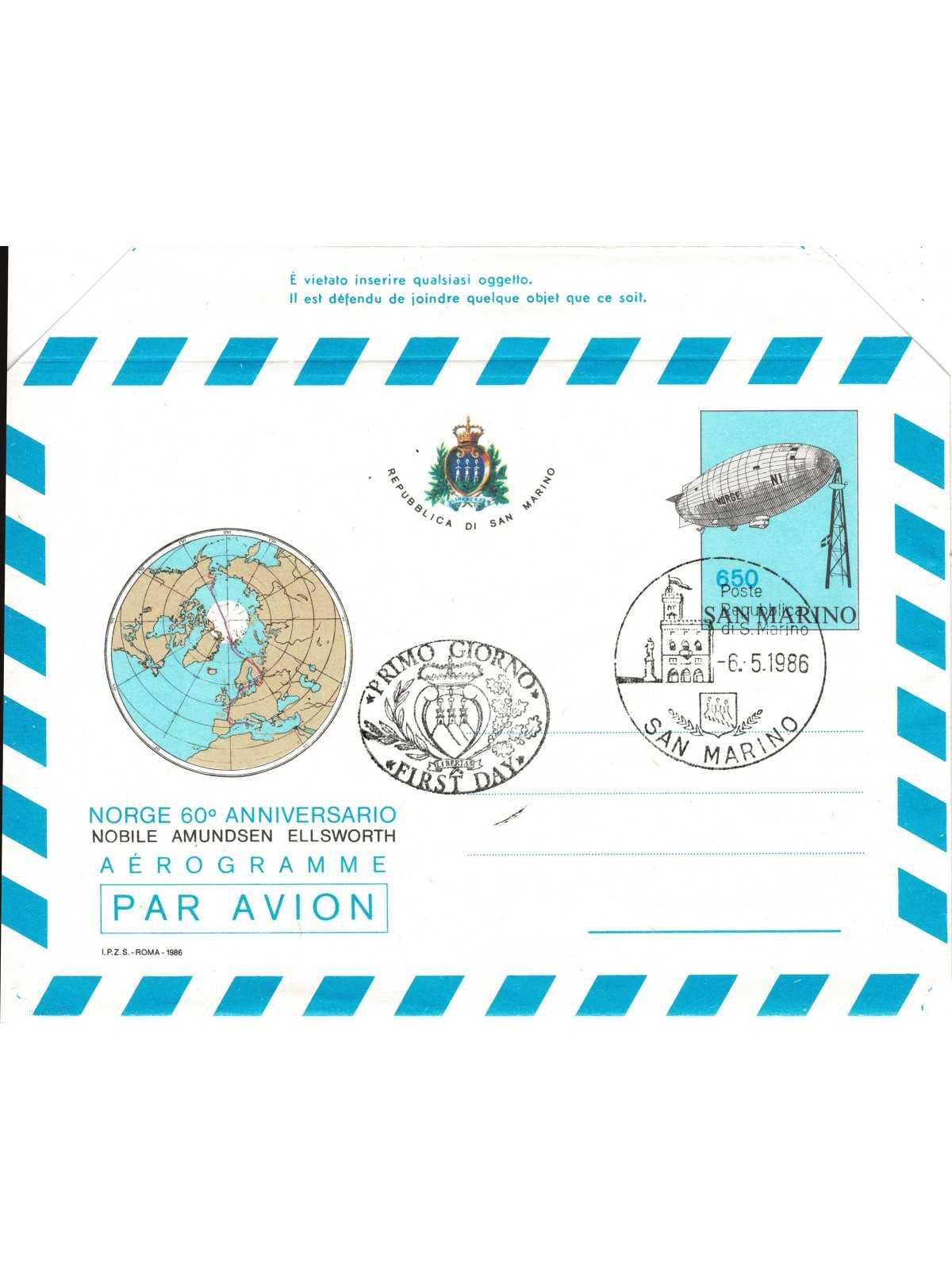 1986 SAN MARINO AEROGRAMMA NORGE 60° ANNIV. VOLO POLO SUD USATO FDC MF135209