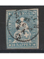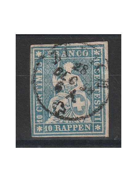 1854 SVIZZERA ALLEGORIA HELVETIA SEDUTA10 RAPPEN AZZURRO N 27 USATO MF140643