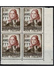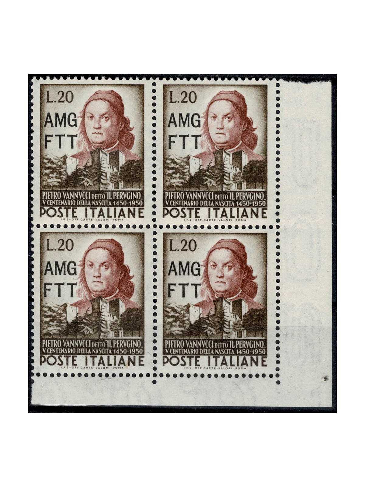 1951 TRIESTE A AMG-FTT 5 CENT NASCITA P. VANNUCCI PERUGINO QUARTINA MNH MF26912
