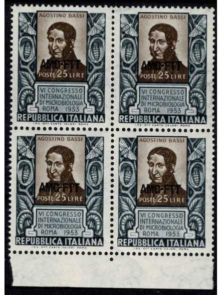 1953 TRIESTE A AMG-FTT MICROBIOLOGIA AGOSTINO BASSI 1 V. QUARTINA MNH MF96640